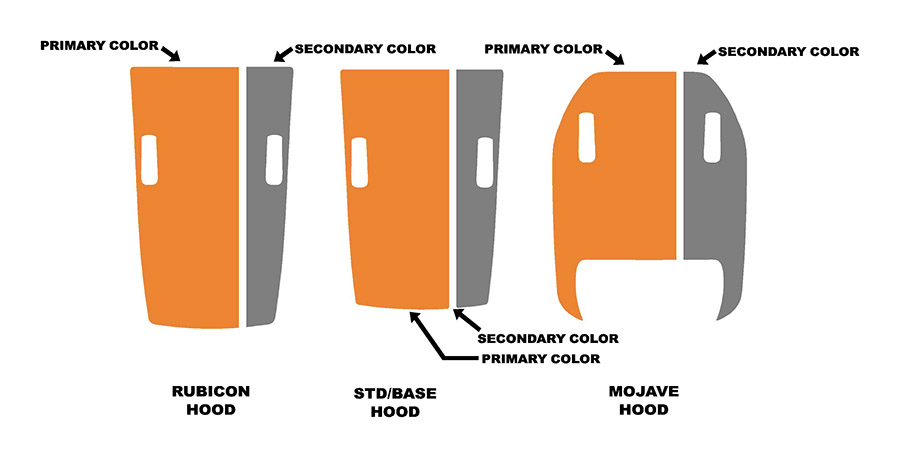 Kit comes compete with Left and Right sections and Tailgate Stripes. Front Fender Jeep Logos and Gladiator Decals must be removed to install this stripe. Matching Hood Stripes available at additional charge for Rubicon, Mojave or Standard hood. Please select below if desired.