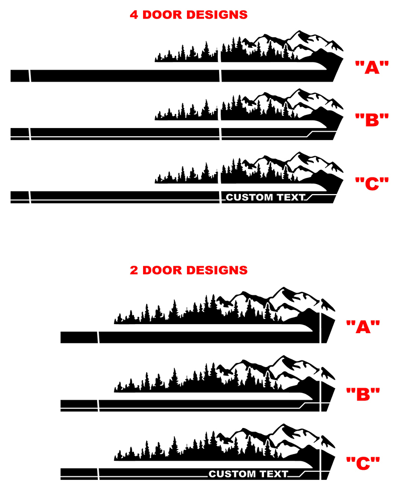 Wildtrak Inspired Mountains Side Graphics Kit for your 2021 - Up Ford Bronco! Make your Bronco Stand out!!! Available for 2 door and 4 Door Models and all Trim Levels. Base, Big Bend, Black Diamond, Outer Banks, Badlands, Wildtrak, Everglades, Raptor and First Edition 2021 - Up Bronco.